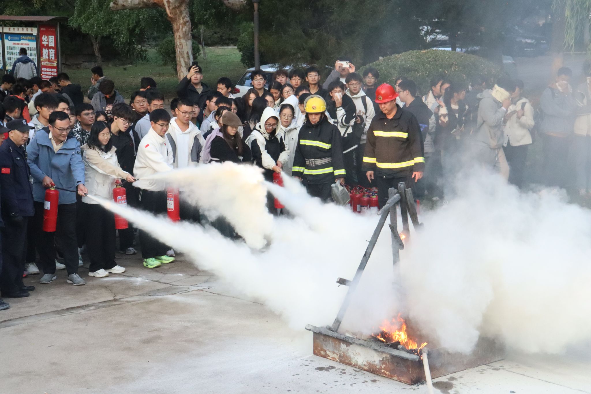 下午16:30,随烟雾弥漫,警报声响起,师生在疏导员的指引下,打湿毛巾捂住口鼻,按照应急逃生预案,沿逃生通道迅速有序地到绿泉广场集合。整个过程紧张有序,无慌乱现象,负责人认真清点核实人数,确保全部师生安全抵达。随后分组进行灭火实战演练,在工作人员指导下,师生亲手拿起灭火器,对准模拟火源进行扑救。
