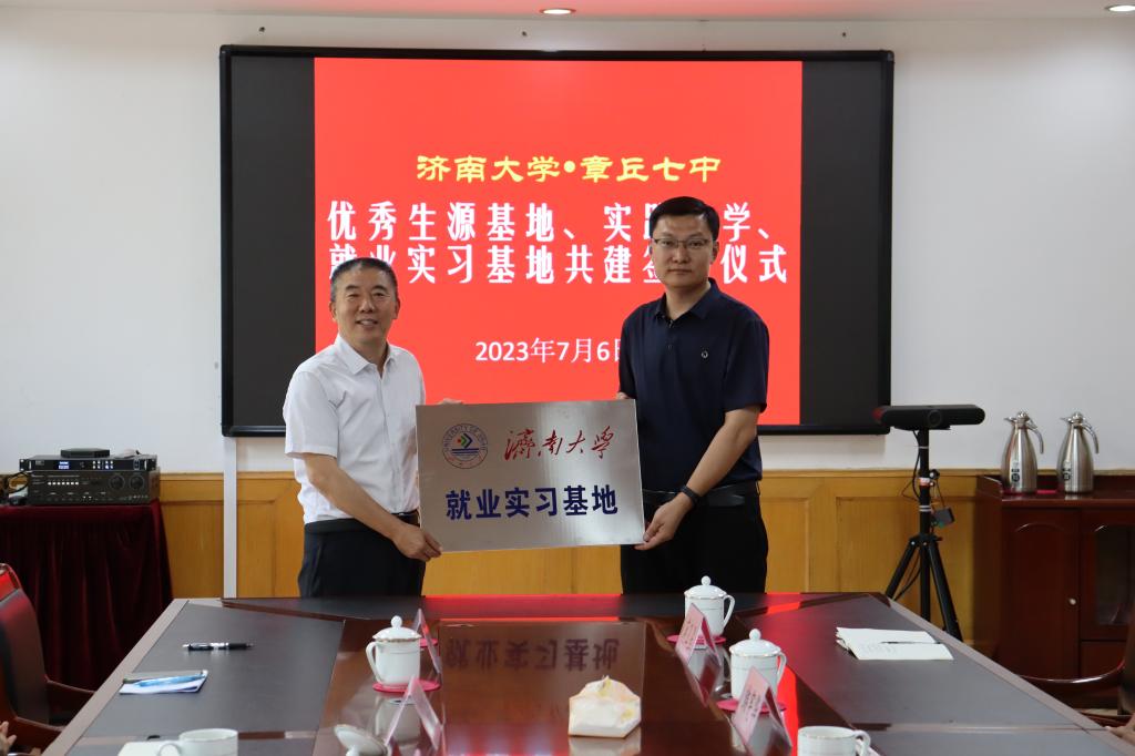 为深入推进学习贯彻习近平新时代中国特色社会主义思想主题教育广泛开展,7月6日,教务处、WilliamHill中文官方网站一行5人赴章丘第七中学举行william威廉中文官网优秀生源基地、实践教学基地、就业实习基地签约授牌仪式。章丘教研中心副主任于学,章丘第七中学校长毕延军,william威廉中文官网教务处副处长兼师范教育管理办公室主任张婷,WilliamHill中文官方网站党委书记侯启海、党委副书记张沂红,以及WilliamHill中文官方网站学办、数学与应用数学系主任参加活动。