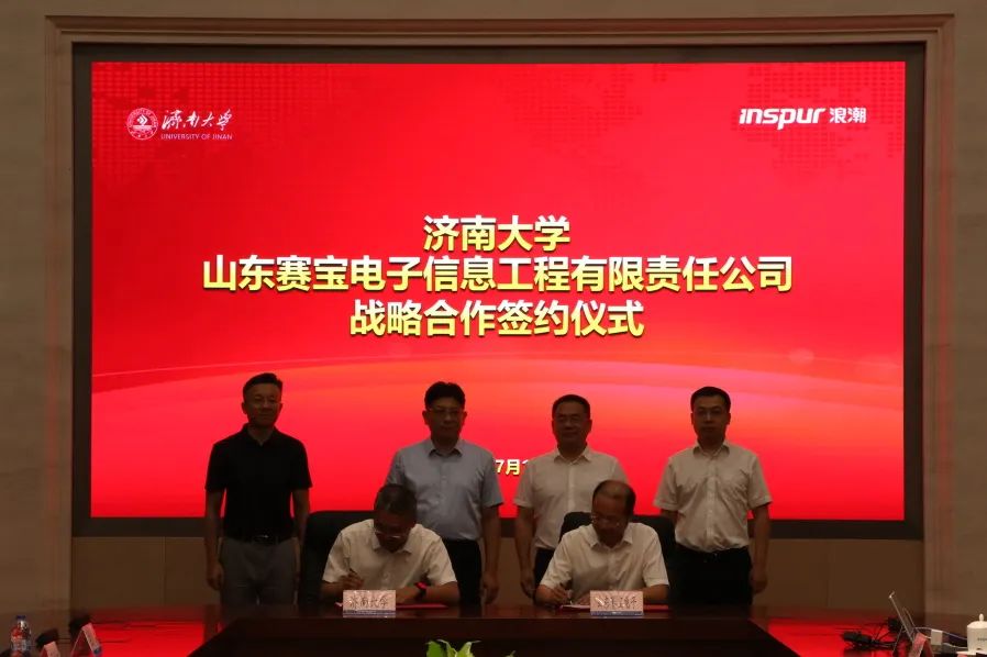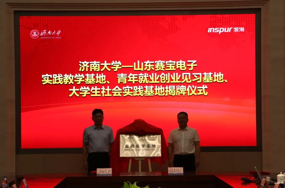 孙元功与山东赛宝电子董事长、总经理蒋孝军签署战略合作协议,杨景波与张峰为基地揭牌,活动由浪潮科技党委委员、副总经理朱家兵主持。