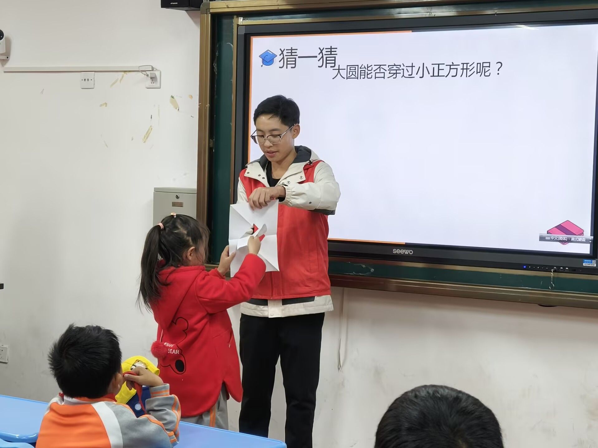 在孩子们充满期待的眼神中,趣味数学课堂开课啦!主讲志愿者手拿一张A4纸和一个圆形纸片,以“如何让圆片不折叠穿过A4纸”为课堂切入点,巧妙引出“莫比乌斯环”的趣味手工课题。学生们在主讲人的讲解和助教们的协助下,亲自动手做出“无限”莫比乌斯环。在动手实践中,学生们不仅锻炼了空间想象力,更提升了逻辑思维能力。随着莫比乌斯环的进一步讲解,志愿者们还介绍了勒洛四面体、“斐波那契数列”、“黄金分割比”以及“克莱因瓶”,以开阔同学们的视野,使同学们深刻领悟数学魅力所在。在课堂的最后,志愿者们列举生活中的实际应用,如过山车、金字塔、艺术构图等,生动地证实了“生活中处处充满数学的美”。