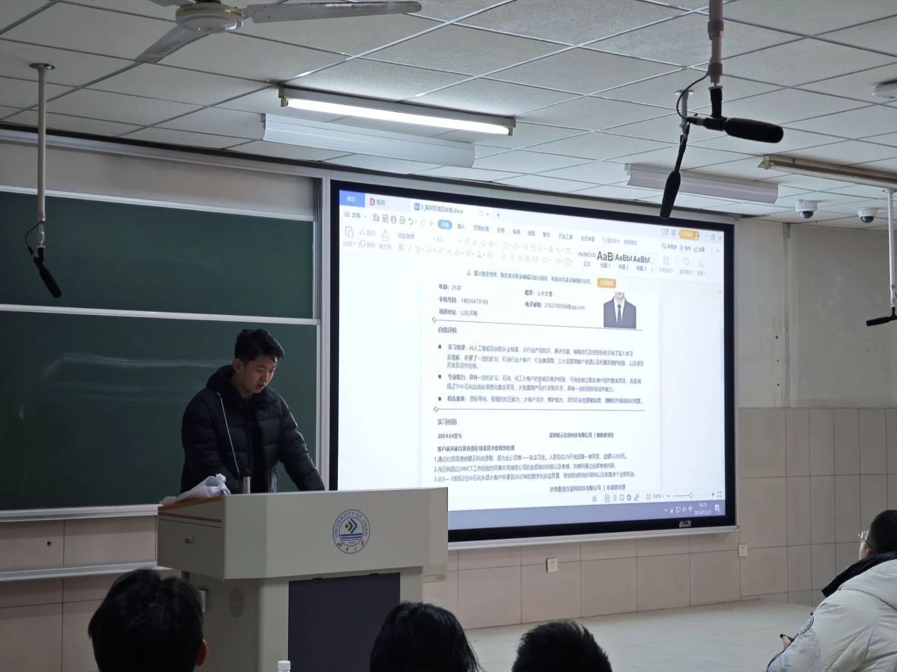 随后,黄昕阳为同学们进行就业经验分享。他不仅向大家介绍了自己求职成功的过程,还向大家介绍了企业的需求,提醒同学们要“对症下药”。在分享的最后,他向大家展示了自己的求职简历,为同学们提供了宝贵的经验,体现了济大学子互帮互助,共同进步的精神。