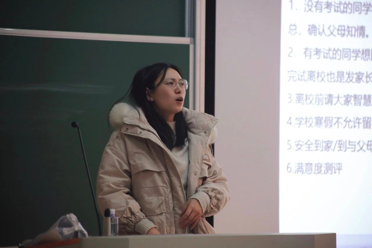 会议伊始,房琳琳向同学们详尽讲述2024年寒假放假安排,并着重强调宿舍安全的重要性,阐明优美宿舍环境给同学们带来的益处,提醒同学们注重个人卫生,创造和谐宿舍关系。在人身安全方面,房老师嘱咐同学们须时刻提高防诈骗意识,注重人身财产安全,谨防溺水、校园暴力等事件的发生。此外,房老师还列举了近几年发生在身边的安全事件,提醒大家在求职期间注意自身安全,谨防误入传销组织,遵守校规校纪,非集中放假期间离开学校须向学院请假备案。最后,她还提醒同学们在寒假期间不要忘记学习,充实提升自我,重视心理健康,珍惜大学最后一个寒假,陪伴父母度过一个幸福且美好的假期。