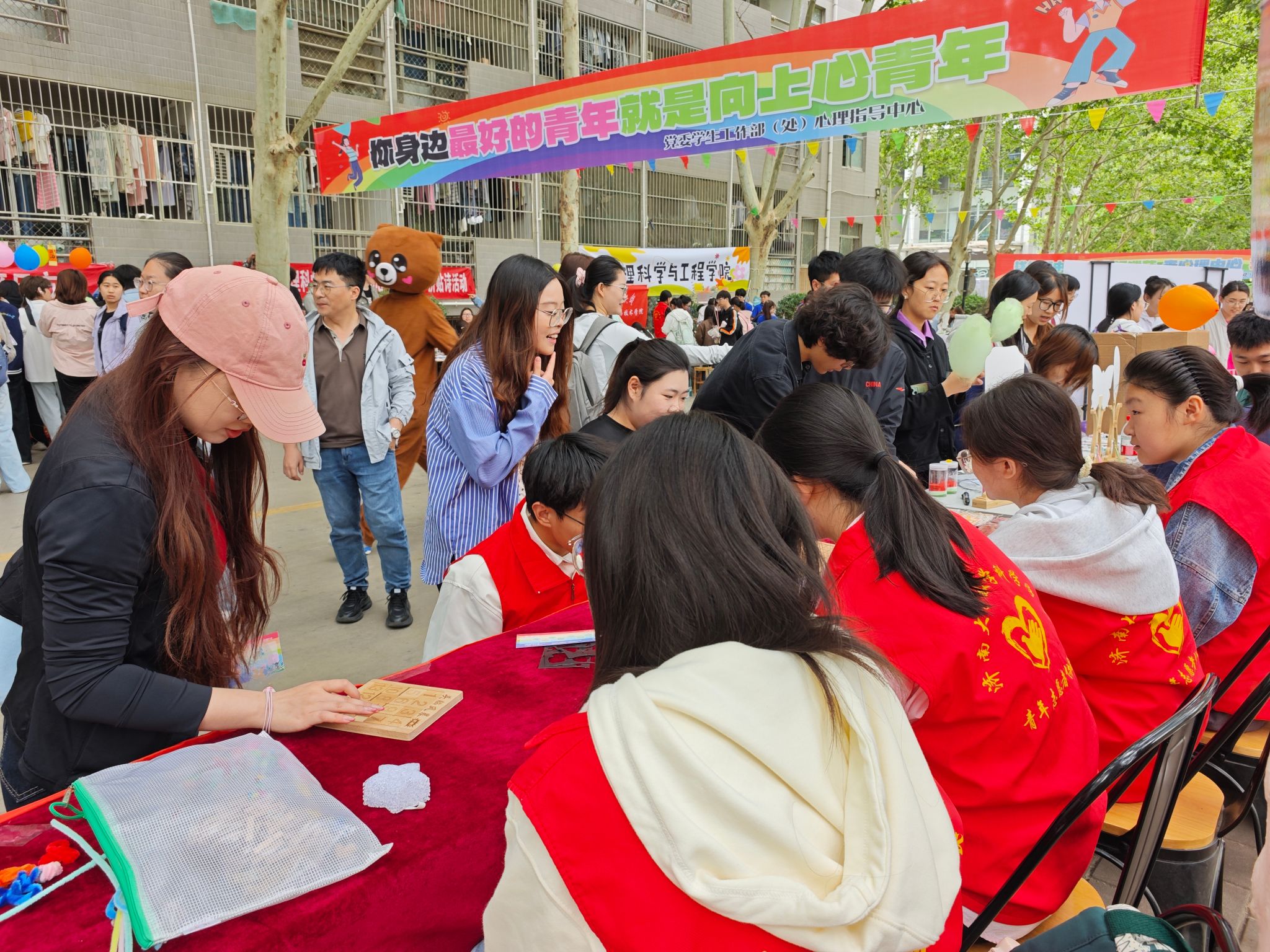 活动现场,彩色气球与趣味标语相映成趣,“我等你,就在数院”等字样传递着温暖与期待。超30项创意活动精彩纷呈,游戏挑战区,同学们全神贯注沉浸于思维与技巧的碰撞;OH卡牌体验区,一个个神秘的卡牌故事引领着同学们探索内心世界;棉花糖DIY台前,甜蜜的香气带领大家重拾儿时的纯真与快乐。志愿者们热情似火、耐心引导,可爱的玩偶在人群中穿梭互动,欢声笑语此起彼伏。集章套圈环节惊喜不断,同学们凭借智慧与运气纷纷收获精美礼品,整个现场沉浸在欢乐的氛围中。
