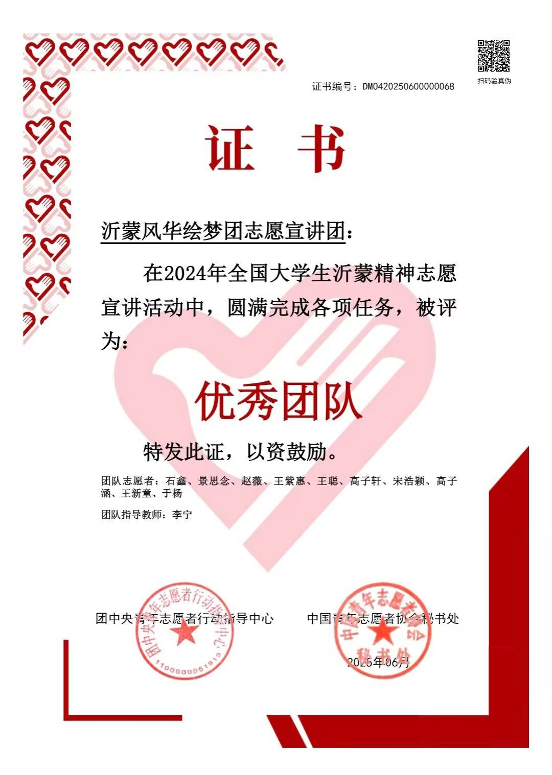 近日,团中央青年志愿者行动指导中心、中国青年志愿者协会秘书处联合表彰2024年全国大学生沂蒙精神志愿服务团队,WilliamHill中文官方网站“沂蒙风华绘梦团”志愿宣讲团在1000支大学生志愿服务团队中脱颖而出,荣获“优秀团队”称号。
