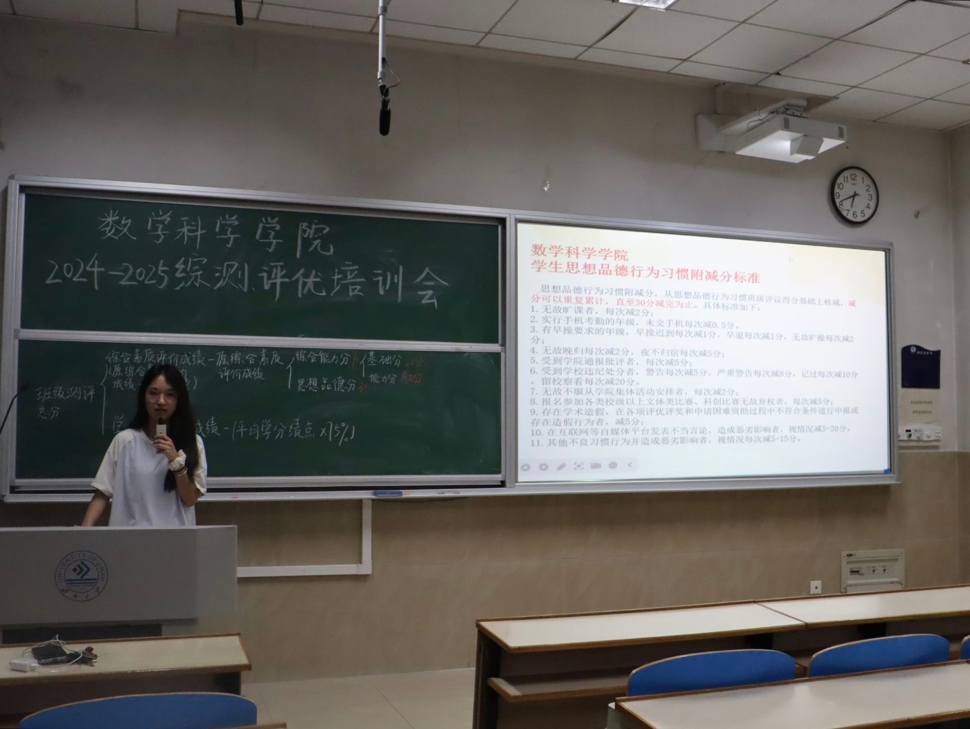 培训会上,学生会主席袁超岐围绕综合测评的成绩构成、能力分细则、思想品德行为习惯评分标准及评优关联项展开详细讲解。她首先明确综合素养评价成绩的计算公式,强调学业成绩(平均学分绩点×75%)在其中的核心占比,同时解析综合素质评价成绩中“思想品德分”“能力分”的构成逻辑。在能力分板块,她针对各类评优树先、社会工作、创新创业等加分项进行分级说明,从国家级到院级,详细列举个人与集体荣誉的加分差异,同时明确社会工作中不同学生干部职务的加分标准,让参会干部对能力分的累加规则有了清晰认知。对于思想品德行为习惯减分标准,她则重点强调旷课、晚归、违规使用手机等行为的扣分细则,提醒大家重视日常行为规范,避免因细节问题影响综合测评结果。此外,学生会主席袁超岐还通过“综合测评盘”直观展示了综合测评与优秀学生、各类奖学金、优秀团干等评优奖项的关联,让学生干部们充分认识到综合测评在大学生发展中的重要性。