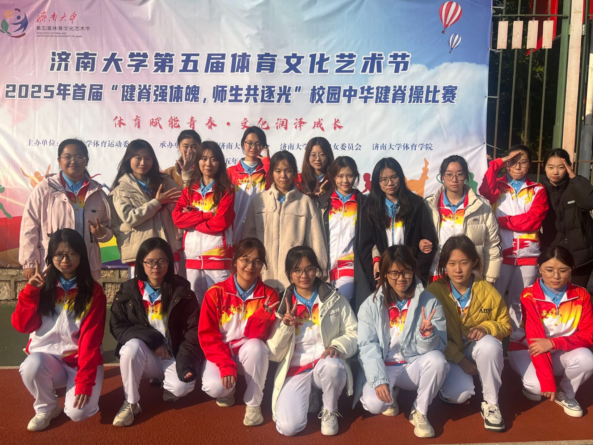 william威廉中文官网第五届体育文化艺术节之2025年首届“健脊强体魄,师生共逐光”校园中华健脊操比赛于10月21日在北苑操场顺利落幕,WilliamHill中文官方网站参赛队伍凭借整齐划一的动作、饱满的精神风貌,从多支参赛队伍中脱颖而出,斩获比赛二等奖。