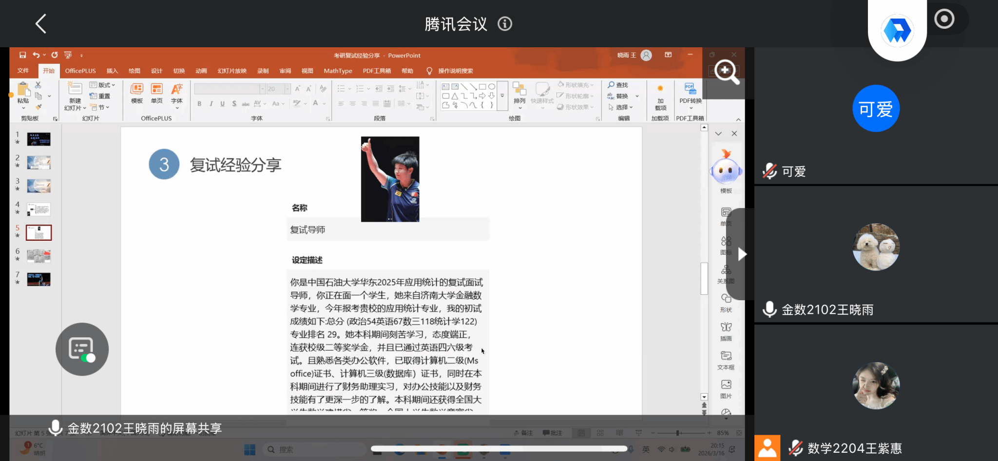 分享会上,庞诗卉首先聚焦面试核心能力,从心态、自我介绍、抽题应答等方面展开细致讲解,她强调答题需沉稳从容,遇熟题不躁、遇生题不慌,自我介绍需打磨中英文双版本,严格控制2-3分钟时长,突出个人优势并引导提问方向,针对时政类、日常类及英文专业类问题,她也给出灵活应对的方法,同时提醒大家面试时要保持大方自信,主动与老师交流互动。紧接着,王晓雨结合自身逆袭上岸的实战经历,从英语、笔试、面试三大模块分享备考方案,她以自身排名靠后却成功上岸的经历印证复试重要性,建议考生强化英语自我介绍背诵,尽早开展笔试复习并保持备考强度,借助模拟训练提升面试表现,同时梳理科研获奖经历、合理制定每日学习计划。最后,程政围绕复试全流程筹备与临场礼仪进行补充讲解,提醒大家密切关注院校官网通知,提前完成材料盖章等准备工作,精心制作涵盖学习与实践经历的个人简历,扎实复习专业课程,面试时注重礼仪细节、灵活应对未知问题,同时提前规划复试住宿,并鼓励排名靠后的同学坚定信心、全力冲刺逆袭。