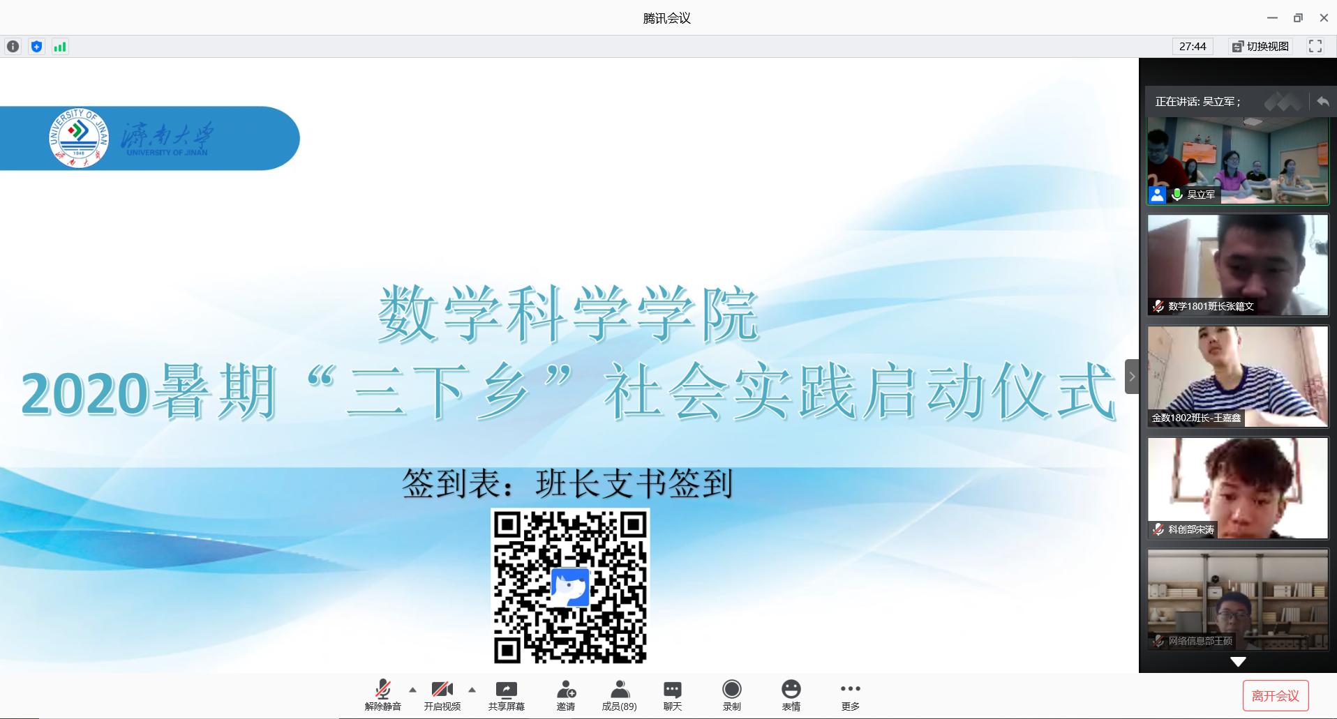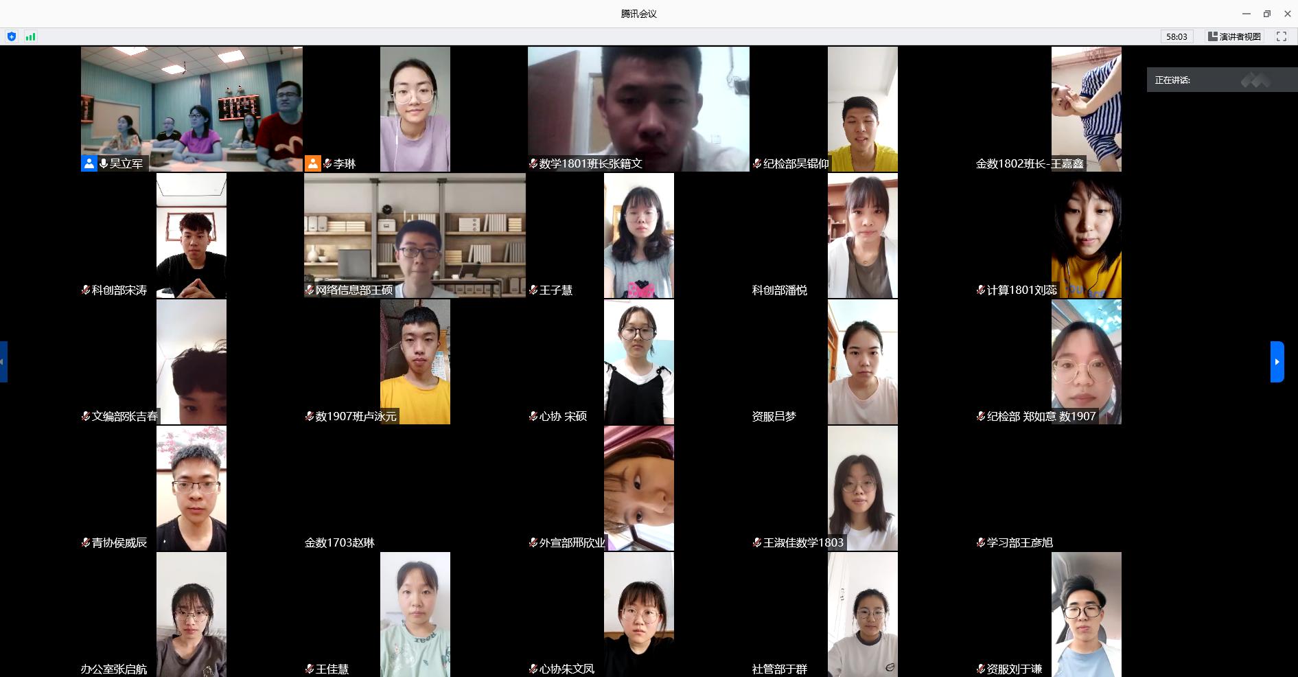 辅导员吴立军传达了校团委《在疫情防控常态化形势下关于组织开展2020年大学生暑期 “三下乡”社会实践活动的通知》,从活动主题、总体安排、主要内容、有关要求等四个方面详细介绍了暑期社会实践的总体安排和组织情况。