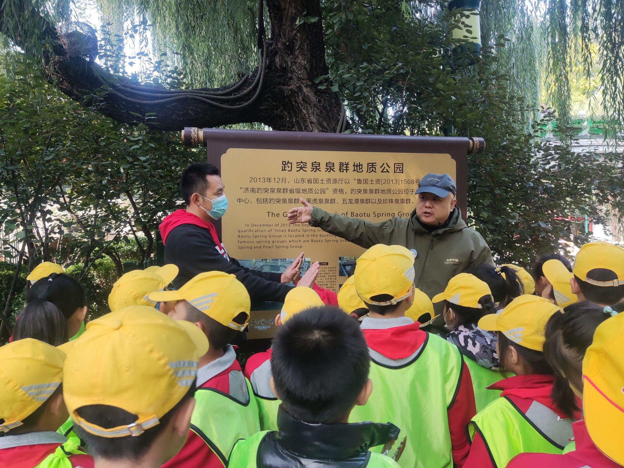 活动开始之前,无痕讲师栗子给大家发放了黑虎泉趣味问卷,丰富的问卷内容不仅引起了大家对黑虎泉的好奇心,也让现场的家长们主动地参与进来。随后,青年志愿者协会的志愿者们为大家分发带有“无痕中国”标志的马甲和专用的垃圾夹,并带领大家依次参观了白石泉、玛瑙泉。在《双虎》雕像前,无痕讲师大麦先介绍了其设计者韩美林,又以问答的形式引出韩美林先生的其他著名作品,激起大家对黑虎泉文化的兴趣和对环境保护的热情心。活动过程中,小朋友们认真地捡拾垃圾,青年志愿者协会的志愿者们在旁边引导他们如何进行垃圾分类。踏过青石板街,拨开柳依纷纷,来到地质介绍图面前,无痕讲师大麦请了现场的一位小朋友和他的家长,以两人的身高比作地势,生动形象地表现了济南“南高北低”的地理特征,又通过岩石的特点阐释了济南泉水四季鼓涌而出的原因。