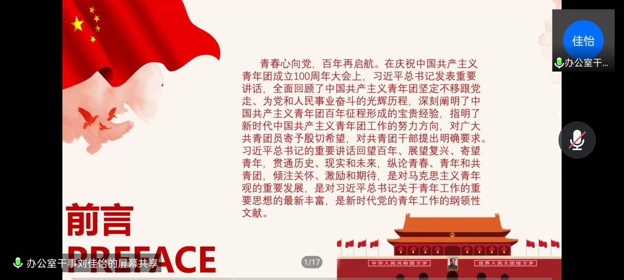为深入学习习近平总书记在庆祝中国共产主义青年团成立100周年大会上的重要讲话,鼓励广大青年坚定理想,引导广大青年增强责任意识,WilliamHill中文官方网站于5月14日晚举办“牢记领袖嘱托,勇担青春使命”主题团日活动。