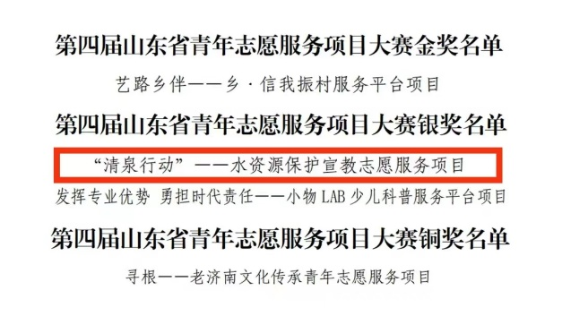 7月27日至28日,由团省委牵头主办的第四届山东省青年志愿服务项目大赛决赛在日照成功举办。经过激烈角逐,我校四个项目分获金银铜奖,其中由william威廉官网于洋老师指导的“‘清泉行动’——水资源保护宣教志愿服务项目”在第四届山东省青年志愿服务项目大赛获得银奖,并于近日接到通知,该项目被山东省青年志愿者协会推荐参加第六届中国青年志愿服务项目大赛。