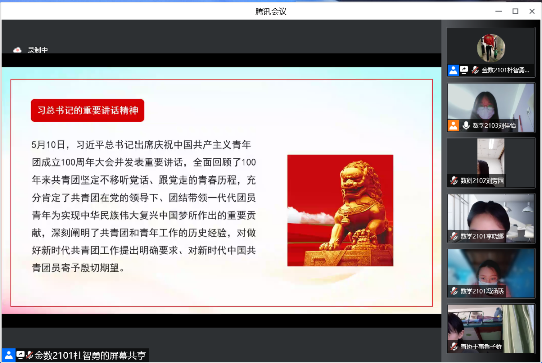 活动伊始,于洋老师向同学们讲述了共青团建团百年的光辉历史,号召新时代的青年团员们要听党话、跟党走。随后,于洋老师带领同学们深入学习了习近平总书记在庆祝中国共产主义青年团成立100周年大会上的重要讲话精神,引导同学们深入体会习近平总书记的殷殷嘱托和谆谆教诲。活动的最后,于洋老师鼓励同学们,身为新时代青年的中坚力量,要不负习近平总书记的热切期盼,不辱使命,不忘初心,以青鸟计划返家乡、暑期三下乡等多种形式将理论学习与实践相结合,为中华民族的伟大复兴贡献自己的青春力量。