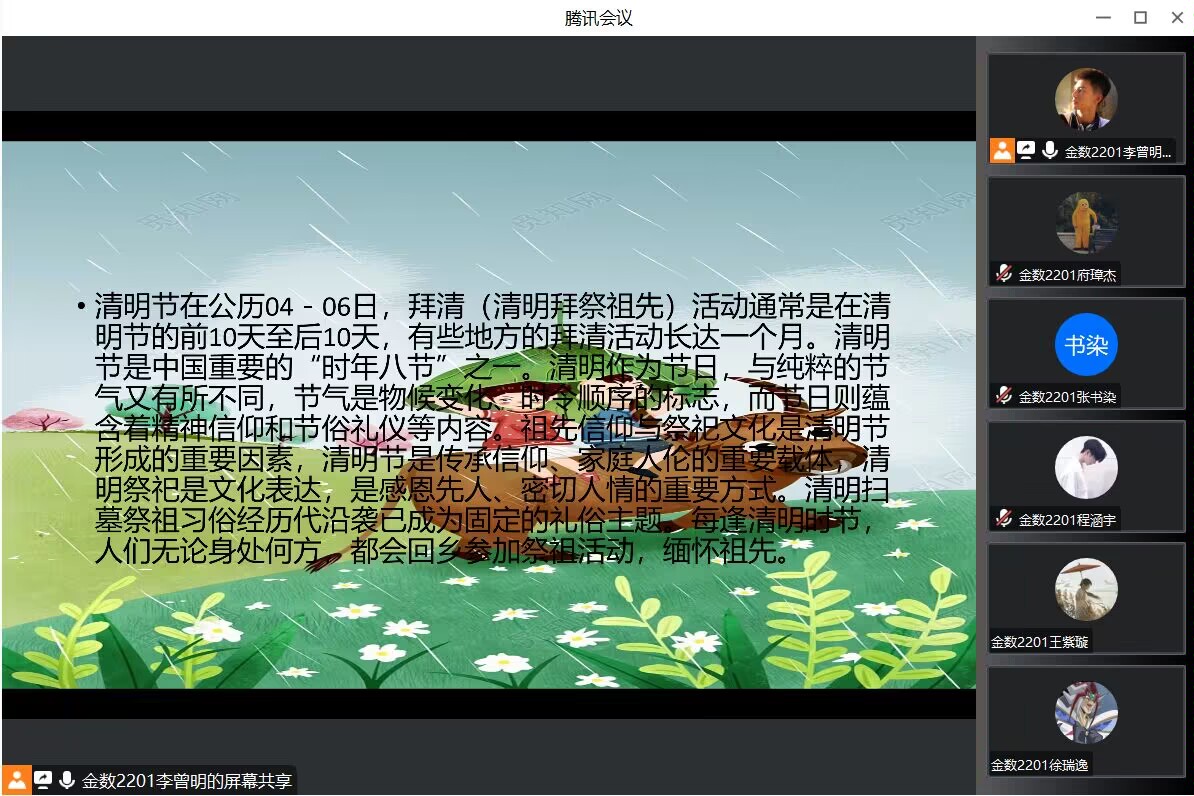 班会主要分为三部分。第一部分,由各班班长带领同学们一起学习了清明节的历史与习俗,了解到了清明其实是寒食节和上巳节两个传统节日的融合,详细学习了扫墓、祭祖、踏青、植树等清明习俗的由来,进一步加深了同学们对中国传统节日的理解,增强了对优秀传统文化的自信。第二部分,同学们一起观看了有关抗战时期革命烈士浴血奋战、保家卫国的红色短片。同时,班长为大家介绍了黄继光、邱少云、刘胡兰、董存瑞等革命英雄,通过讲述他们的伟大事迹激发了同学们对革命先烈的崇敬和怀念之情。第三部分,同学们畅所欲言,抒发了自己的感想。“缅怀先烈,就要传承先烈遗志,建设美好家园”同学们纷纷表达了自己对烈士的怀念,坚定了接续奋斗,建设祖国的目标。
