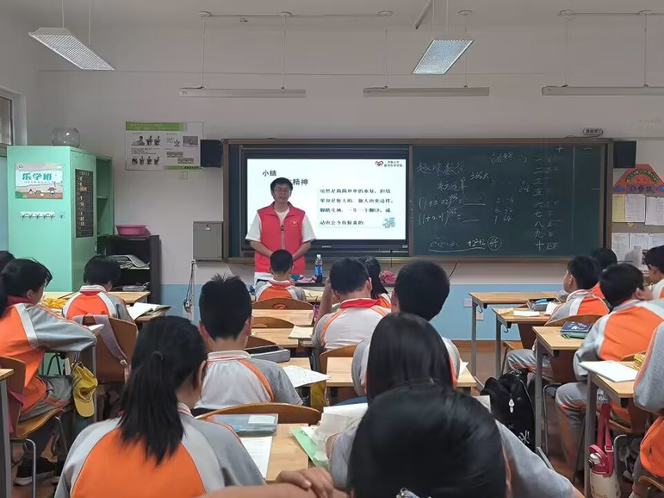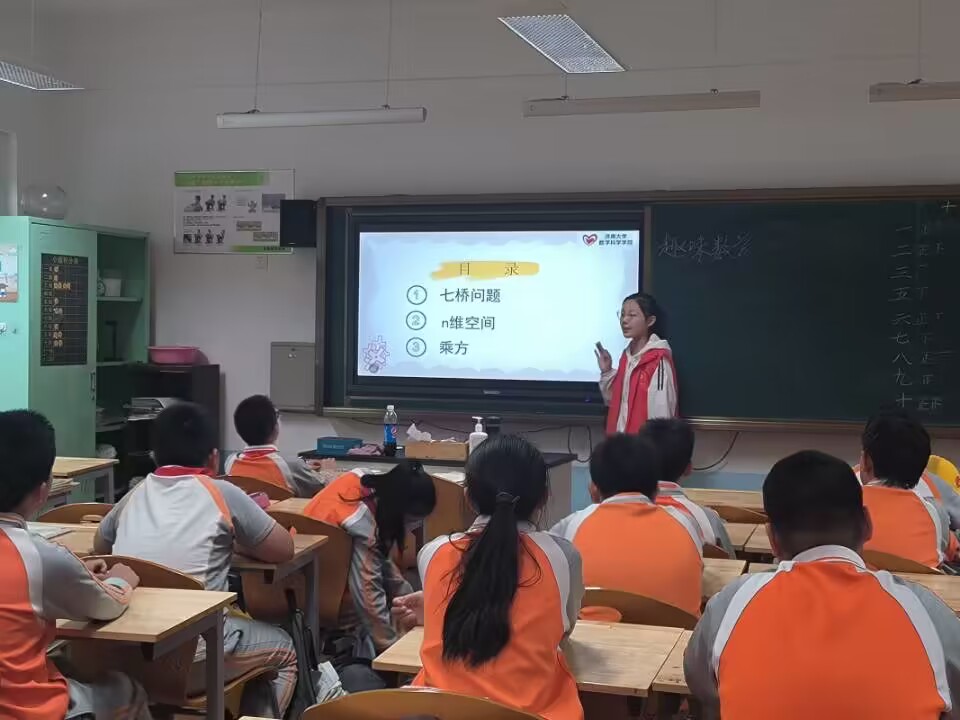 课堂开始,志愿者先向同学们讲述了有趣的小故事,引出了著名的“七桥”问题,引起了同学们的热烈讨论。讨论结束,志愿者讲解了正确的解题思路,并列举了类似的问题让同学们练习,进一步巩固了同学们对知识的掌握。然后,志愿者给同学们讲述了n维空间的知识,并通过生活中的具体事物对数学中的点、线、面、体等定义作出了形象地说明,使同学们对抽象的概念有了更具体的认识。接着,志愿者们演绎了生动的寓言故事,从而引出了乘方的概念,并协助同学们动手折纸,让同学们真切体会到了“指数爆炸”的数学魅力。最后,志愿者们以数学中乘方的计算向同学们展示了“即使是百分之二的努力,只要坚持,也会产生千倍的成绩”,使同学们深刻感受到了坚持努力的重要意义。