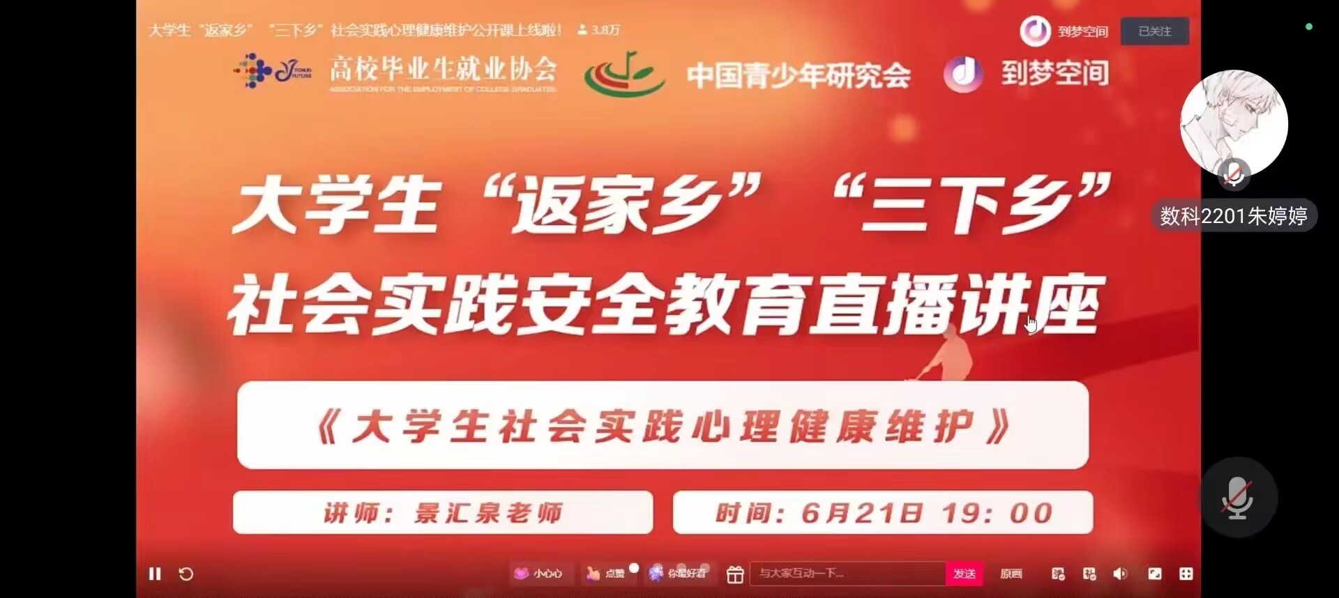 为了加强大学生在暑期社会实践中的安全意识,做好实践前的培训指导工作,6月21日,WilliamHill中文官方网站积极组织各实践队的同学们观看由学校团委联合到梦空间承办的2023年大学生“返家乡”、“三下乡”社会实践安全教育直播专题讲座,倡导同学们重视实践安全教育,推动实践教育的规范化、有序化、科学化开展。WilliamHill中文官方网站各实践队的同学们通过腾讯会议聆听此次讲座。