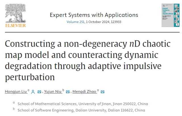 1. 题为“Constructing a non-degeneracy nD chaotic map model and counteracting dynamic degradation through adaptive impulsive perturbation”的研究论文(https://doi.org/10.1016/j.eswa.2024.124238),刘红军副教授为第一作者和通讯作者,大连大学牛玉军副教授为第二作者,研究生赵梦迪为第三作者。