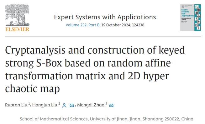 2. 题为“Cryptanalysis and construction of keyed strong S-Box based on random affine transformation matrix and 2D hyper chaotic map”的研究论文(https://doi.org/10.1016/j.eswa.2024.123933),研究生刘若冉为第一作者,刘红军副教授为研究生导师兼通讯作者,研究生赵梦迪为第三作者。