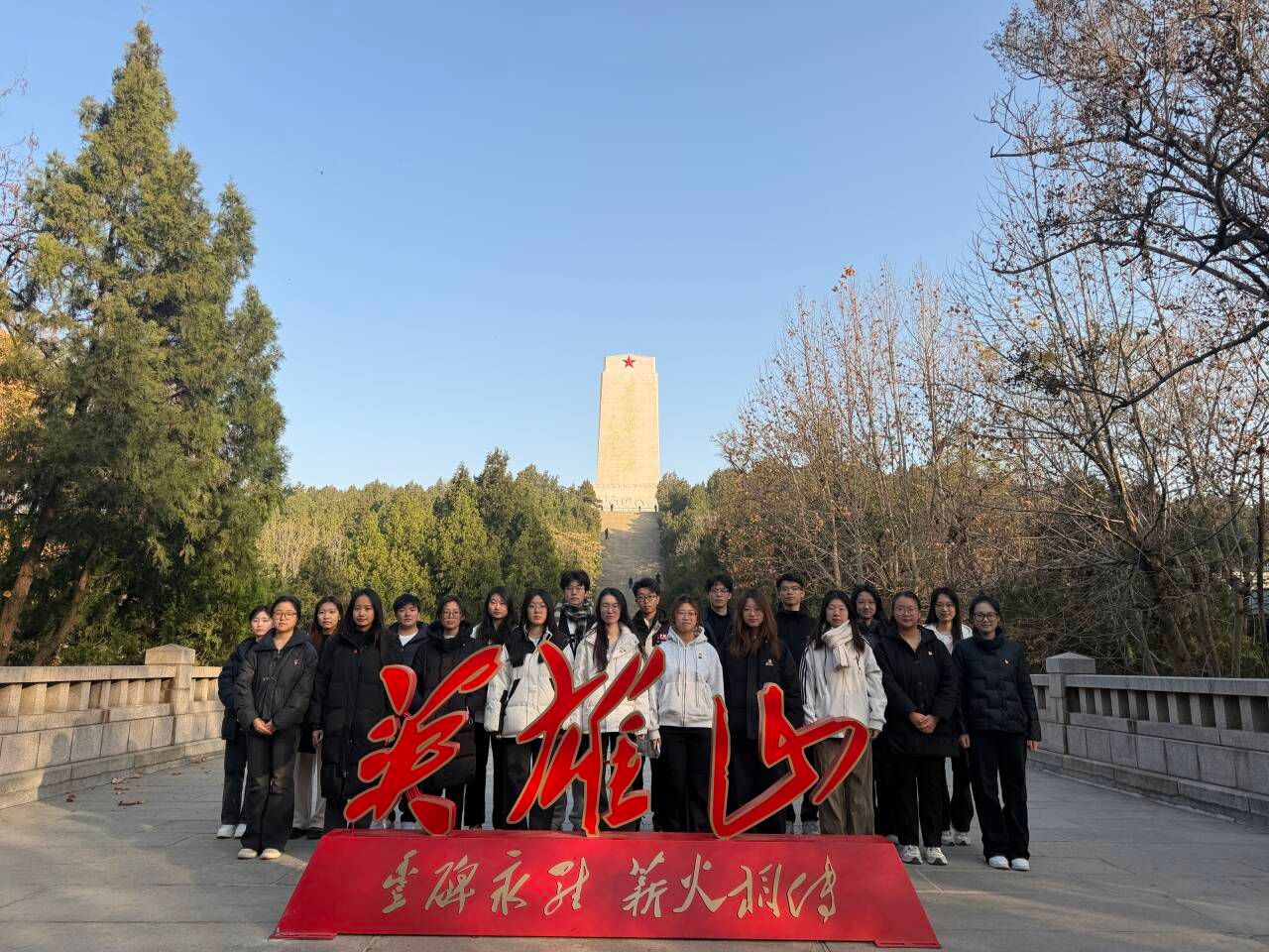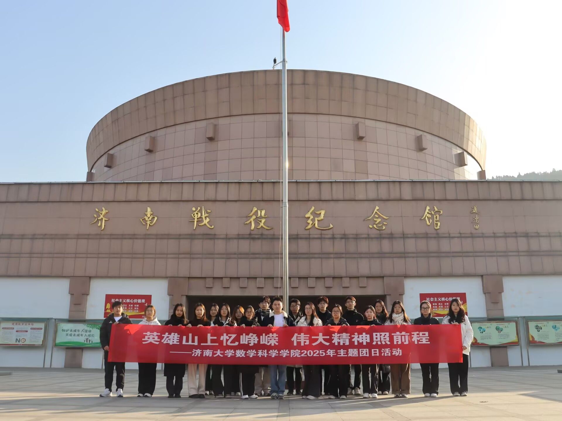 11月5日,组织新发展团员、“青马工程”第十五期大学生骨干培训班学员集体参观《伟大胜利——济南战役史实展》,通过珍贵影像、实物资料重温烽火岁月,体悟革命先辈的忠诚信仰与无畏牺牲,从本土英雄事迹中汲取奋进力量。11月29日,赴英雄山开展“红色教育+志愿服务”主题团日活动,全体团员在济南战役纪念馆前重温入团誓词,学院团委书记姬磊以“数字里的战役密码”为题讲授特色团课,将金融数学、运筹优化专业思维与战役战略部署相结合,让红色学习更具学科特色。